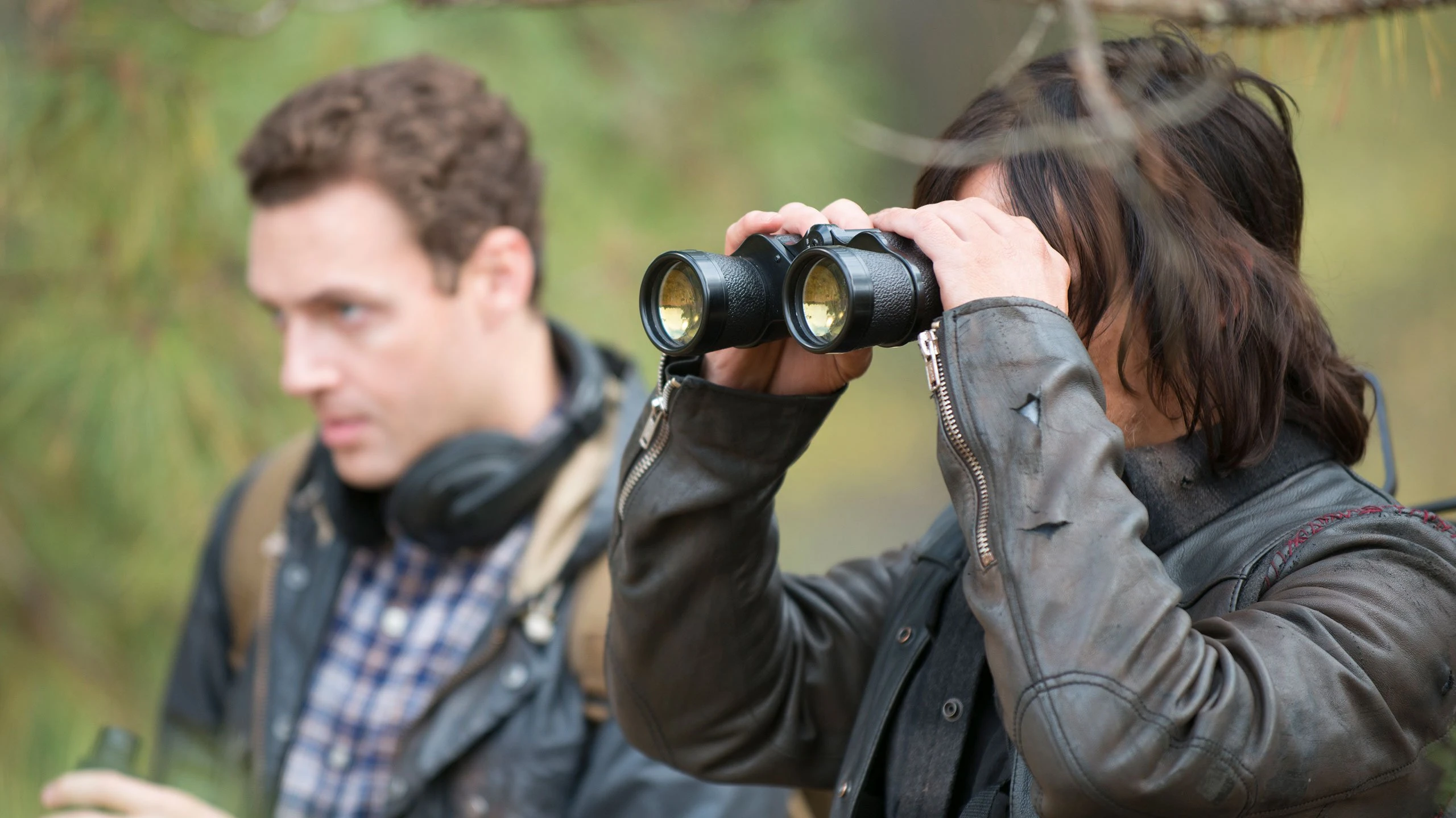 Daryl und Aaron beobachten einen Mann in einem roten Pullover, der sich mit wilden Lauch einreibt, um Mücken fern zu halten.