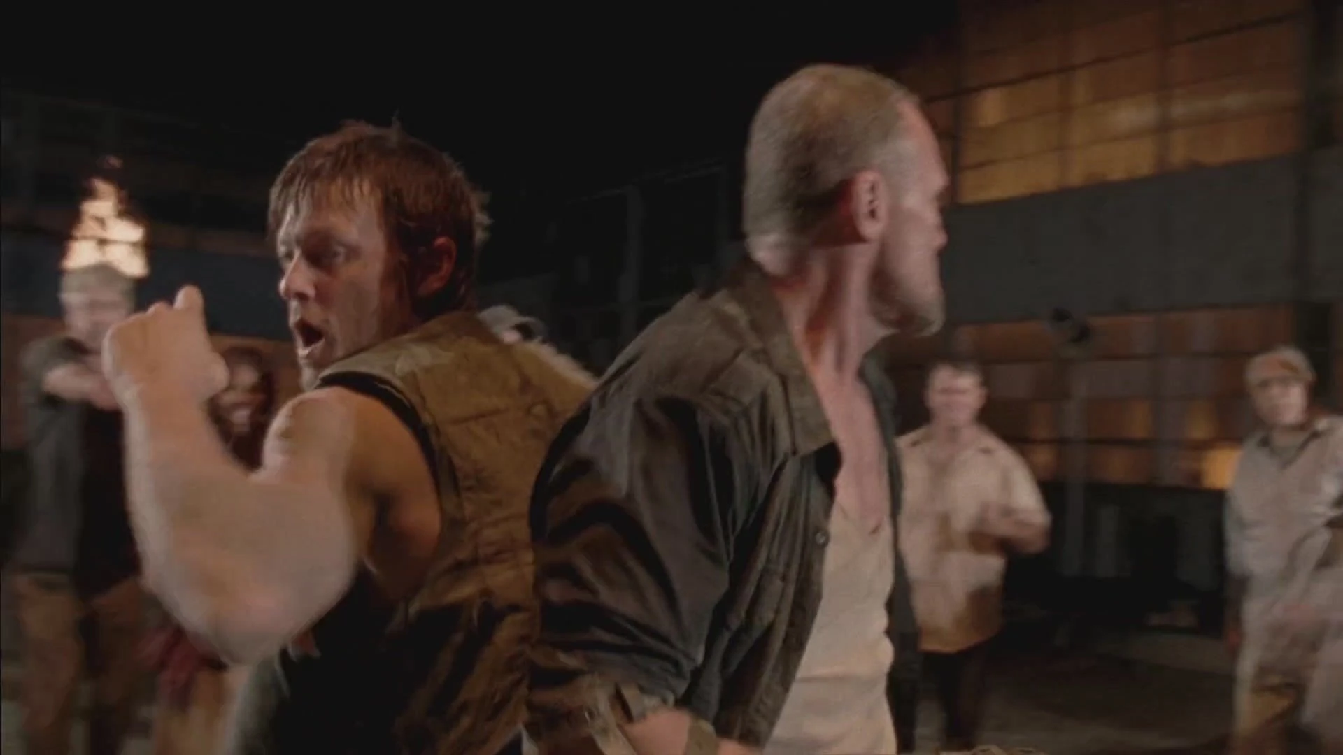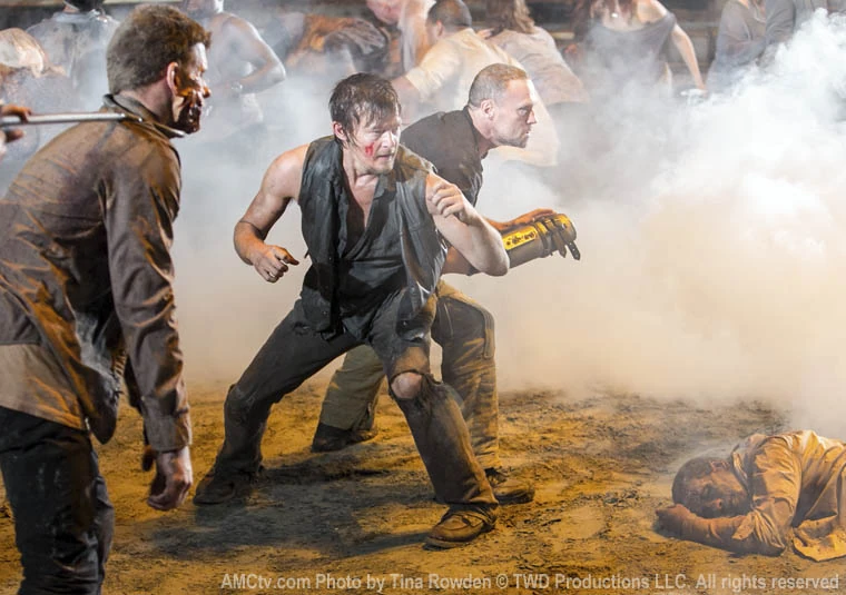 ![]() El Gobernador decide hacer que Daryl y Merle peleen a muerte, el que sobreviva se iría. Merle dice que hará lo que sea por probar su lealtad con el pueblo y golpea a Daryl una cuantas veces, el pueblo entero grita su nombre, algunos soldados introducen caminantes en la arena de batalla, Merle intenta acabarlos y su hermano aprovecho para golpearlo por atrás, pero el manco Dixon logro arrojarlo al suelo. Hermano contra hermano, Daryl intentando ahorcar a Merle le pregunta si cree que el Gobernador los dejara irse, el racista hombre le responda que siga su ejemplo, entonces levanta a Daryl e intenta tirarlo contra los caminantes. Ambos intentan acabar con los zombies y uno esta cerca de morder al cazador, pero en ese momento una bala atraviesa el cráneo del caminante y su protector, detrás de un cesto de basura, Maggie y Rick empiezan a sembrar el caos en la arena de batalla, Rick arroja una granada de humo haciendo que los caminantes logren escapar y atemorizar a la gente, Rick con su linterna indica por donde escapar, entre el humo, Andrea mira tristemente el cuerpo de Haley y toma su arma. Daryl y Merle por su parte escapan junto a Rick y Maggie. ![]() En otra parte de la ciudad, Merle golpea las chapas que construyen el muro de Woodbury urgiendo a Rick a escapar, el sheriff le dice que no vendrá con ellos, pero Merle sigue golpeando hasta lograr abrir una fuga, el sale primero y acaba con una caminante golpeándolo con su bayoneta, pide ayuda y Maggie junto a Daryl. Los sobrevivientes se alejan del pueblo dejando vivos a algunos caminantes un caminante empieza a tirar del metal y logra abrirse paso dentro de los muros. ![]() Por la mañana, Glenn y Michonne están soñolientos apoyados en la camioneta cuando de repente el grito de Rick los despierta, ambos van a ver que sucede cuando ambos encuentran entre el grupo a Merle ambos apuntan con sus armas al hombre y son detenidos por Rick y Daryl que intentan calmarlos, Merle mientras tanto se burla de todos y entre medio revela la relación de Andrea y Michonne y que la rubia se acostaba con el Gobernador, produciendo la incertidumbre sobre el tema, Rick interroga a Michonne, la cual no le responde y es sucedida por Merle quien cuenta un poco del pasado de Michonne haciendo que Daryl lo haga callar y ambos empiezan a discutir, Rick toma cartas en el asunto y noquea a Merle con un culatazo de su revolver. ![]() ![]() En la carretera, Rick, Daryl Glenn y Maggie discuten que hacer con Michonne y Merle, Glenn insiste en no querer a Merle durmiendo cerca de las mujeres del grupo y Daryl le dice que no es un violador, pero Glenn le responde que su amigo si lo es haciendo que Maggie lo mire de mala manera. Al final deciden no dejar seguir a Merle con ellos, a lo que Daryl se enoja alegando que dejarían seguir a Michonne y no a Merle, entonces se aleja diciendo que seguirá por su cuenta con su hermano. Glenn intenta detenerlo hablando sobre su relación con Carol a lo que el cazador respondió que ella entendería, Rick intenta hacer que Daryl regrese y llegan a la camioneta, donde el hombre toma su mochila y se dispone a partir, no sin antes decirle que se cuide y a su familia. Rick enojado empieza a tomar las armas y guardarlas con furia en el baúl, después de forma cortante le dice a Michonne que la vendaban y ella se iba, Rick sube al auto y arranca con furia. ![]() Nuevamente en la prisión, el grupo de Tyreese carga el cuerpo de Donna y se preguntan donde podrán enterrarla. Allen da un paso al frente y observa a Carl y Carol y le dice a Tyreese que seria facil tomar la prisión y le ordena a Ben arrebatar el rifle de Carol, Sasha y Tyreese los intentan hacer entrar en razón, mientras hablen, Beth y Axel llegan a entregarle al grupo herramientas para enterrar a Donna, Allen se acerca sonriente para tomar los objetos y empezar con la revolución, pero Tyreese y su hermana son mas rápidos y las toman primero, Beth y el ex recluso ofrecen su ayuda y se retiran. Allen los ve alejarse esquivando la fulminante mirada de Tyreese y Sasha. ![]() En el camino a la prisión, Rick Glenn y Maggie bajan de la camioneta para despejar el camino, Rick revisa el vehículo que estorba y le ordena a Glenn que le saque los frenos al coche. El chico asiático abre la puerta de la camioneta que estorbaba el camino y un caminante sale de ella, el dolorido muchacho lo tira al suelo y empieza a patear la cabeza de la criatura para descargar su ira por la tortura de Merle , la violación de Maggie y la partida de Daryl. Glenn se enojo con Rick por no haber asesinado al Gobernador ,haber salvado a Daryl y Merle y que el cazador los halla abandonado. También se quejo de no haberlo llevado consigo a la misión y Rick le respondió que no estaba en condiciones. Glenn se enojo porque había llevado a Maggie y que Rick no sabia lo que le habían hecho. Maggie dijo que debían irse, que hablarían en la prisión, y el joven coreano dijo que hablarían ellos, puesto que el ya no tenia de que hablar. ![]() En Woodbury, Milton espera a Andrea en la puerta de la enfermería. Cuando la mujer sale le da a conocer a Milton que había un total de nueve heridos en el lugar y que la enfermera se encarga de eso. En los portones, Martinez, Shumpert y algunos soldados de Woodbury impiden que los habitantes abandonen el pueblo. Andrea llega a la escena y una mujer llamada Karen le suplica que los deje ir, algunos caminantes llegan a la escena y los soldados empiezan a eliminarlos, un hombre empieza a tocar el claxon del coche haciendo que Martinez baje y le apunte con su arma tirándolo al suelo, Andrea hace que se calme haciéndole entender que complicaba mas las cosas, unos gritos se oyen a unas cuadras y Andrea y el hombre con la multitud detrás corren a ver que sucede, Andrea logra ver a un hombre siendo devorado por dos caminantes y asesina a ambos, Martinez dispara su arma y mata a otro caminante que se acerca, todos miran a el hombre agonizante y Karen les pide